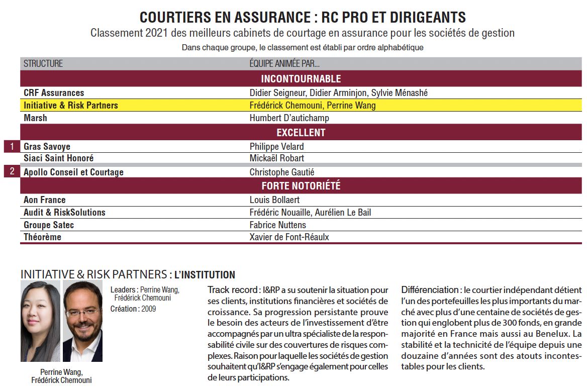 Nous avons le plaisir et la grande satisfaction de vous annoncer qu'INITIATIVE & RISK PARTNERS a obtenu, en 2018, 2019, 2020 et de nouveau en 2021, la plus haute distinction décernée par le magazine Décideurs - Leaders League dans son classement annuel des spécialistes de la couverture des risques de responsabilité.