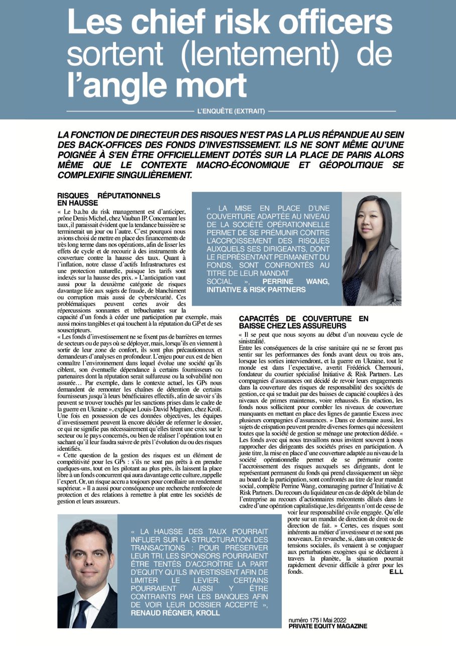Interview of Perrine WANG in Private Equity Magazine, about the need to adapt the support of the actors of the financial sphere, in particular the Investment Firms and the portfolio companies as well as their executives, within the frame of the coverage and the management of their complex risks, notably considering the current context and its foreseeable evolution.